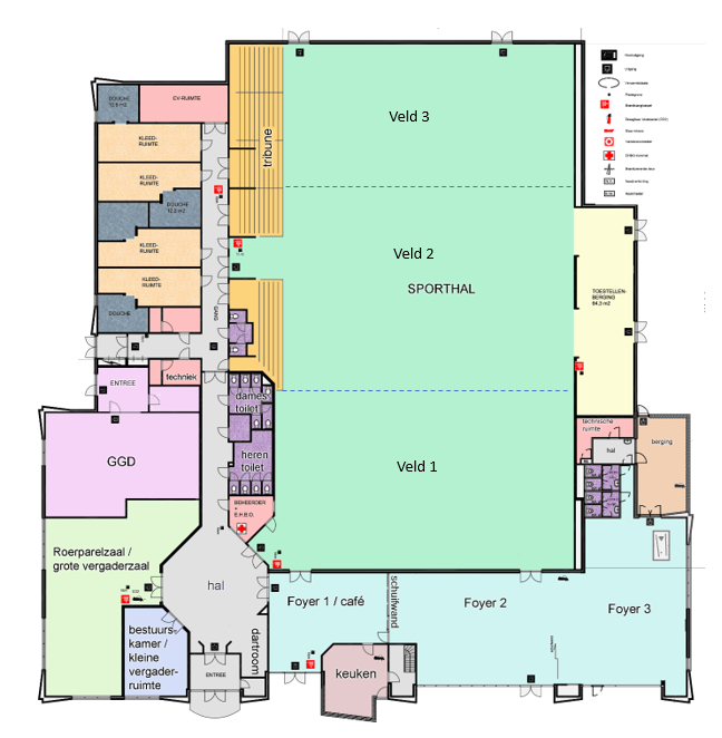 De sporthal is door middel van een scheidingswand in 2 of 3 delen te splitsen. De hal kan in 3 gedeelten verhuurd worden, veld 1, 2 en 3. De sporthal is voorzien van een LBK installatie voor de luchtverversing en verwarming cap 13000 m³/uur. -